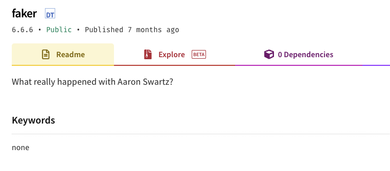 기존의 Faker 문서는 없어지고, What really happend with Aaron Swartz? 라는 말만 Readme에 적혀있다.