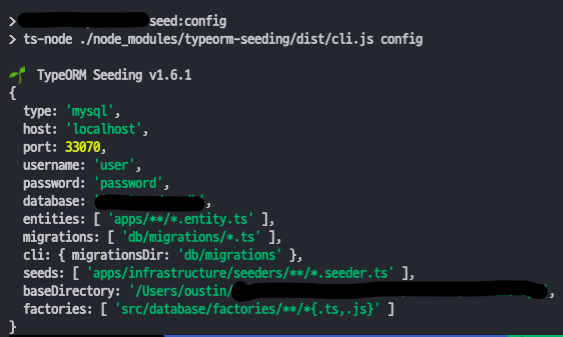 scripts를 추가한 package.json이 위치한 디렉토리에서 npm run seed:config를 통해 ormconfig.js의 설정이 제대로 적용되었는지 체크해볼 수 있다.