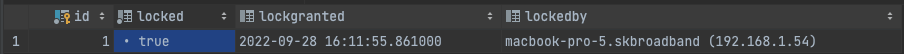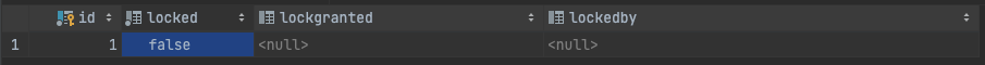 해당 에러가 발생한 원인을 추측해보면 개발 도중에 로컬 서버 node 프로세스가 비정상적으로 죽어버렸고, 비정상적인 프로세스의 종료로 인해 databasechangeloglock 테이블에 현재 상태가 반영되지 않은 것으로 생각된다. 만약 서버 프로세스가 정상적으로 종료되었다면 아래처럼 locked 칼럼은 false에 나머지 칼럼들은 null로 되어 있어야한다.
