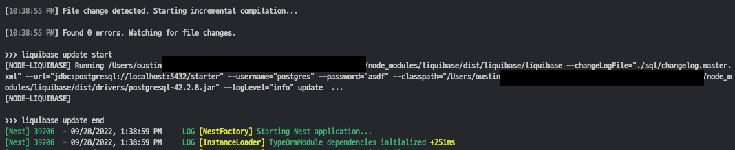 회사내에서 프로젝트를 진행할 때는 대부분 NestJS, TypeORM, RestAPI를 기본 스펙으로 잡고 진행하는데 외부에서 진행되던 프로젝트가 NestJS, TypeORM에 Liquibase 라는 처음 접하는 데이터베이스 버전 관리 툴을 사용하였는데 내부로 인수인계가 다 되진 않은 상태에서 local 환경에서 개발하다 $ npm run start:dev를 했는데 정상적인 상황이라면 아래처럼 서버가 실행되어야 정상이다.