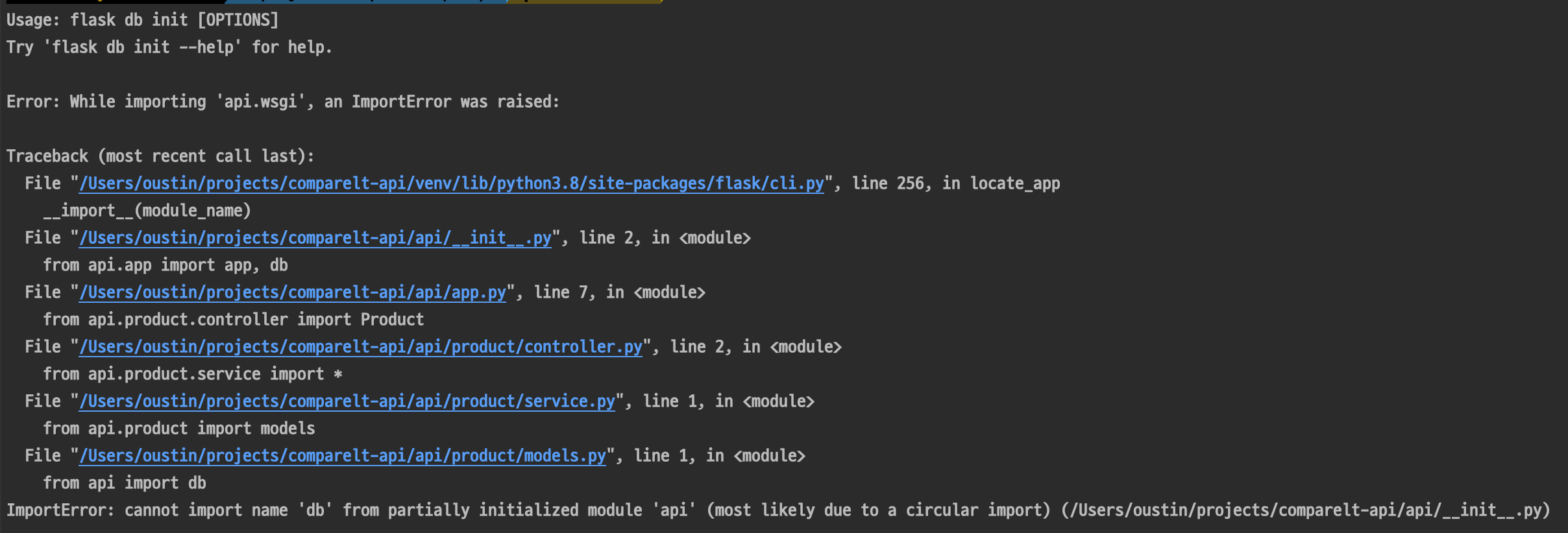 Flask로 API 서버를 구성하면서 flask db init을 하였을 때, 위와 같은 에러가 발생하였다.