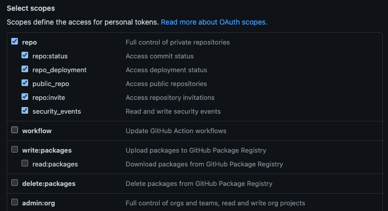 Github -> settings -> 사이드 바에서 development settings 혹은 development -> Personal Access Token 순으로 이동하면, 현재 사용하고 있는 토큰이 리스트로 쭉 나타날 텐데 현재 사용하고 있는 토큰을 클릭해서 내리다보면 Select Scopes라 되어있는 부분이 있다.