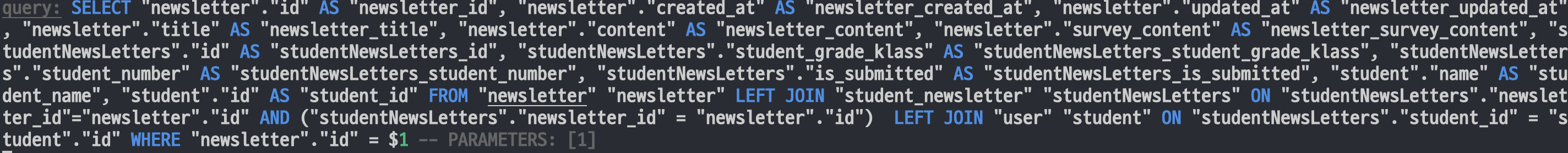 .leftJoin을 통해 studentNewsLetters 테이블에서 newLetterId가 위에서 SELECT해온 newsletter의 id값과 같은 경우만 JOIN을 해서 위의 조건을 충족한 row의 'id', 'isSubmitted', 'studentGradeKlass', 'studentNumber'를 SELECT한다.
