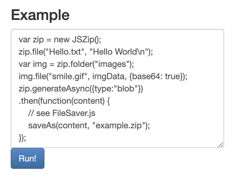 JSZip의 공식 문서를 확인해보면 아래처럼 예제 코드 자체는 단순하다.